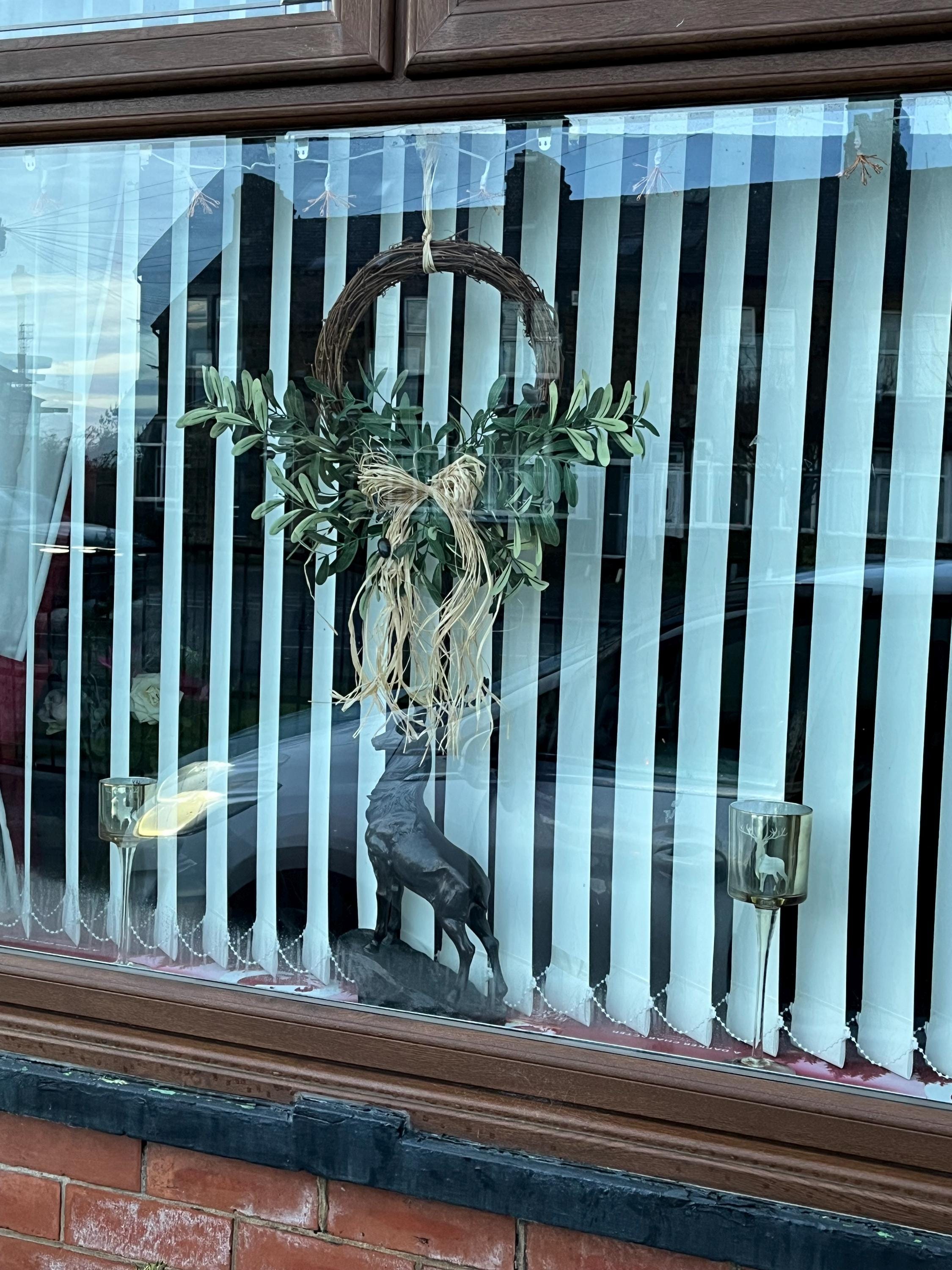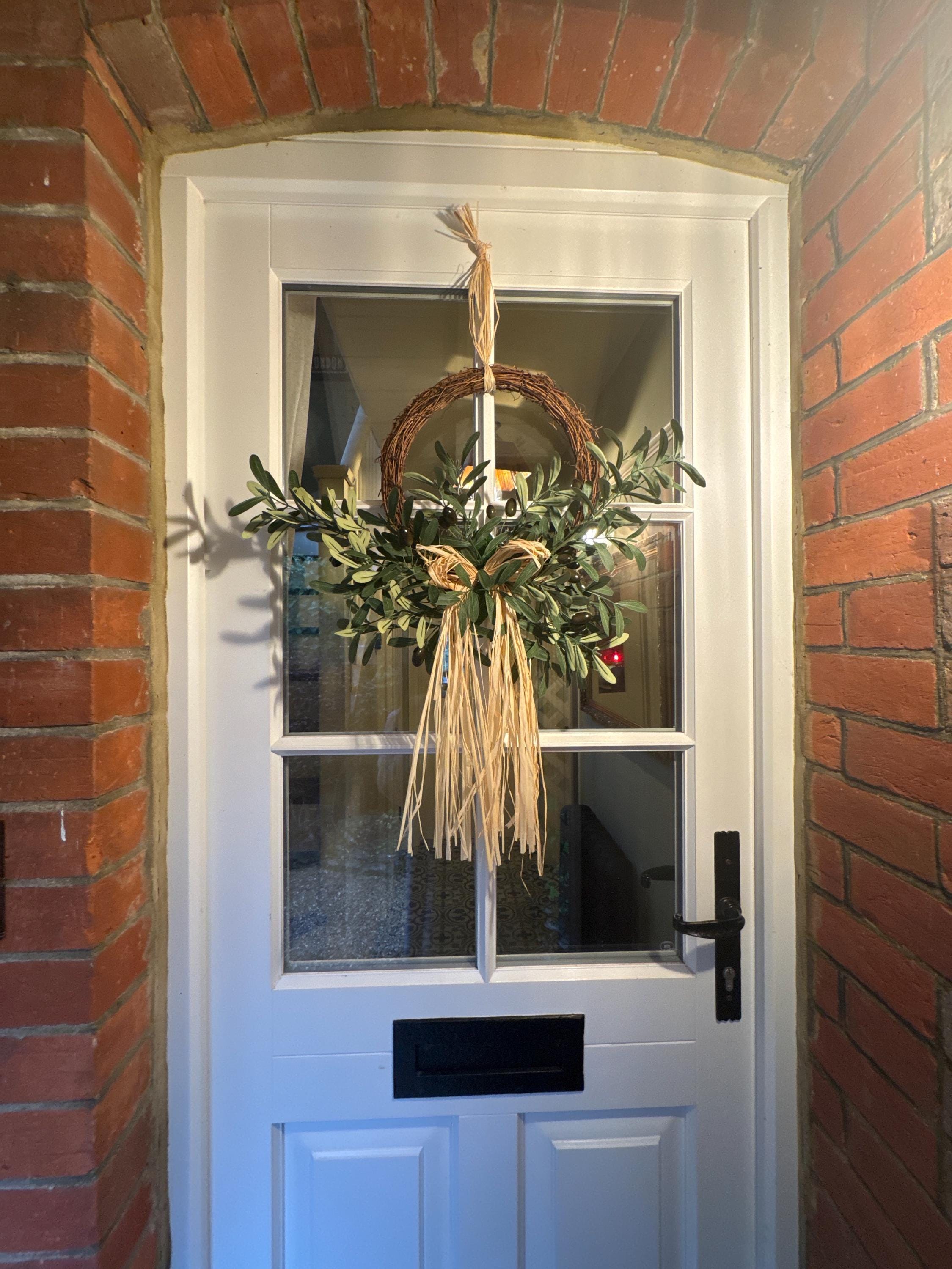 The olive wreath is beautiful and will look fabulous on my front door, after I've fixed it! This is because, through NO fault of the seller who I have had excellent communication with, but the box was very badly damaged with the result being that I now have to fix many of the olives back on as they were rolling around in the box! Hopefully this will be successful and they will not come off again in the elements. If not for the postal system I'm sure this would have been perfect.